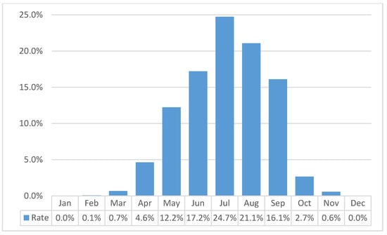Tick bites were observed in more than half of all LB cases—4576 (61.6%). There was no statistically significant difference for tick bites ratio between men and women: 62.8% and 60.9%, respectively (p = 0.107). Frequency rate of clinical symptoms was the same between groups of LB patents with and without tick bites (for all symptoms, p < 0.05). Tick bites were primarily observed in high season months, from May to September (90%), with the highest peak in July (Figure 1). There was a higher number of tick bites (p = 0.003) in the urban residents.