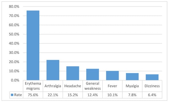 Only 996 patients had complete data regarding their clinical symptoms, and for the remaining 6428, the data were unknown. Erythema migrans occurred in 753 (75.6%) LB cases and remained the most frequent symptom, while other symptoms were observed in less than a quarter of all LB cases (Figure 2). Clinical symptoms were independently distributed between men and women (p = 0.651), but subjects with clinical symptoms were clinically significantly older: mean age 52.1 (± 18.30) vs. 48.7 (± 19.59) years (p < 0.001). Urban people suffered from erythema migrans more frequently than village residents (p < 0.001).