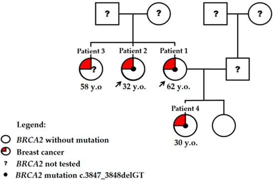 Pedigree of individuals with BRCA2 c.3847_3848delGT mutation. Patients described in details are indicated by the arrow. Three sisters were diagnosed with breast cancer, while genetic testing was performed for two of them. Two daughters of the proband were tested for BRCA2 mutation, and one was mutation and cancer-positive. Y.o.: Age at diagnosis is indicated.