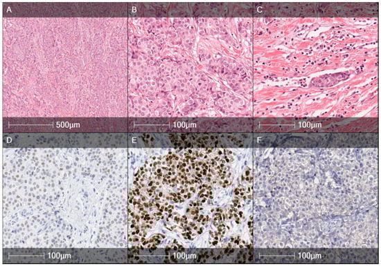 Histology specimens of the proband (age 62) (A,D), younger sister, Patient 2 (age 32) right breast tumor, year 2008 (B,E) and left breast lesion in 2014 (C,F). Proband’s tumor Hematoxylin and Eosin (HE) slides demonstrate poorly differentiated (G3, Nottingham grade 8) ductal carcinoma composed of confluent trabecular structures and tumor sheets without any presence of glandular differentiation (A). Tumor cells reveal marked nuclear polymorphism (D) and a high mitotic rate (up to 10 mitoses per 10 high-power fields (HPF)). Patient 2′s (year 2008) right breast tumor was diagnosed as high grade ductal carcinoma with solid growth pattern (B) and highly polymorphic tumor cells and numerous mitoses (E). The tumor was triple negative, expressed high-molecular-weight cytokeratins (CK5 in particular), and was regarded as “basal-like carcinoma”. Note the pushing margin in the periphery of the tumor (B). Patient 2′s left breast lesion (year 2014) with ductal carcinoma in situ (DCIS) of high grade: C—multiple spaces involved by cribriform pattern DCIS with some comedo necrosis. A high-power view of the lesion is shown in F. The cells show that nuclear polymorphism and several mitotic figures are evident.