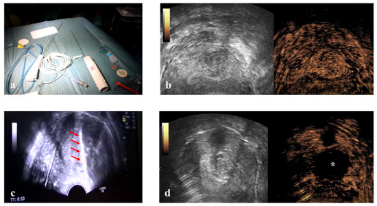 (a) 35 cm long 17 Gauge radiofrequency electrode at the left of the table and an 18 gauge disposable core biopsy instrument at the right. (b) Contrast-enhanced ultrasound (CEUS) evaluation before radiofrequency ablation of a fibroid. (c) Hyperechogenic line within the myoma viewable during the biopsy (arrowheads). (d) CEUS evaluation after radiofrequency (RF) ablation demonstrates no residual contrast enhancement within the fibroid (asterisk).