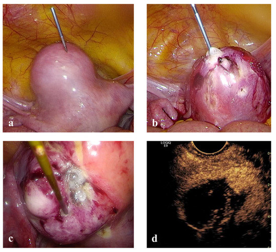 (a) RF electrode inserted directly into the abdomen without the aid of any trocar. (b) and (c) RF ablation of uterine myomas under laparoscopic control. (d) Intra-operative trans-vaginal CEUS during Laparoscopic RFM.