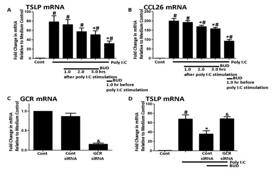 (A,B) Time course of suppression of poly I:C-induced thymic stromal lymphopoietin (TSLP) and CCL26 mRNA by budesonide. The poly I:C (5 ug/mL)-induced TSLP and CCL26 mRNA were suppressed when budesonide (10−7 M) was added 3 hours prior to harvest or pre-applied before poly I:C stimulation. (C,D) Glucocorticoid receptor (GCR) was knocked down by the siRNA method and the cells were stimulated with poly I:C (5 ug/mL). (D) Budesonide (10−7 M) was added 1 hour prior to poly I:C stimulation and the suppressive effect of budesonide was diminished. Data represent mean ± SEM of four independent experiments. # p < 0.01 by t-test when compared with medium-only control. * p < 0.01 by t-test when compared with poly I:C-treated cells and p < 0.01 by t-test when compared with control siRNA-transfected cells. & p < 0.01 by t-test when compared with control siRNA transfected cells.