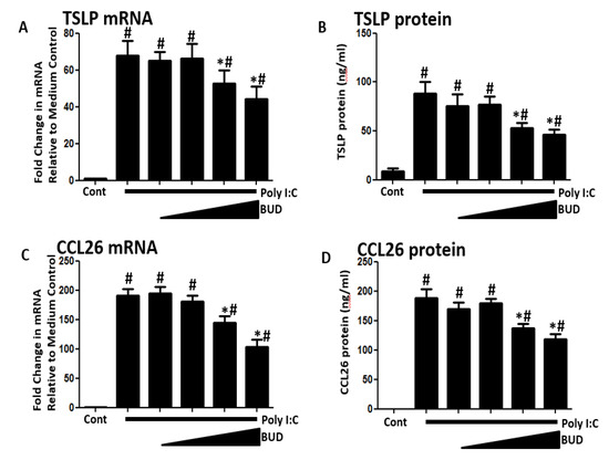 Poly I:C (5 ug/mL)-induced (A,B) TSLP and (C,D) CCL26 was suppressed by budesonide in a dose-dependent manner. The used budesonide concentration was 10−6, 10−7, 10−8, and 10−9 M. Data represent mean ± SEM of four independent experiments. # p < 0.01 by t-test when compared with medium-only control. * p < 0.01 by t-test when compared with poly I:C-treated cells.