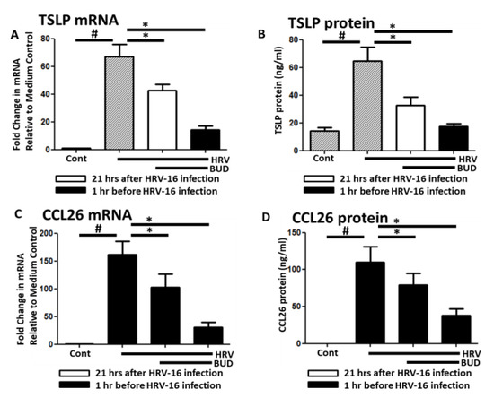 HRV-16 (MOI = 1) infection induced both TSLP and CCL26 mRNA and protein expression in NHBE cells. Similar to the poly I:C tests, these expressions were significantly inhibited by 10−7 M BUD applied 1 h before infection or 3 h before cell harvest (Figure 3).