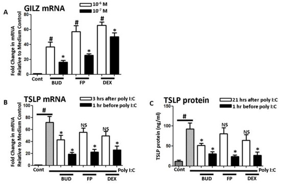 Poly I:C (5 ug/mL)-induced TSLP by other corticosteroids. (A) Stimulation with either budesonide (BUD) (10−7 or 10−6 M), fluticasone propionate (FP) (10−7 or 10−6 M), or dexamethasone (DEX) (10−7 or 10−6 M)-induced glucocorticoid-induced leucine zipper (GILZ) mRNA. (B,C) TSLP mRNA and protein were not inhibited when FP and DEX were added 3 h prior for harvest, while adding BUD, FP, and DEX before poly I:C stimulation inhibited the TSLP induction. Data represent mean ± SEM of four independent experiments. # p < 0.01 by t-test when compared with medium-only control. * p < 0.01 by t-test when compared with poly I:C-treated cells. NS: not significant when compared with poly I:C-treated cells.