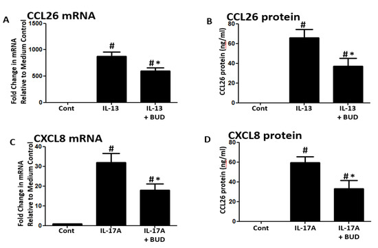 Inflammatory cytokine-induced genes by the late addition of budesonide. (A,B) IL-13 (100 ng/mL)-induced CCL26 mRNA and protein were suppressed by the addition of budesonide (10−7 M) 3 h before the harvest. (C,D) IL-17A (100 ng/mL)-induced CXCL8 mRNA and protein were suppressed by the addition of budesonide 3 hours before the harvest. Data represent mean ± SEM of four independent experiments. # p < 0.01 by t-test when compared with medium-only control. * p < 0.01 by t-test when compared with IL-13- or IL-17A -treated cells.