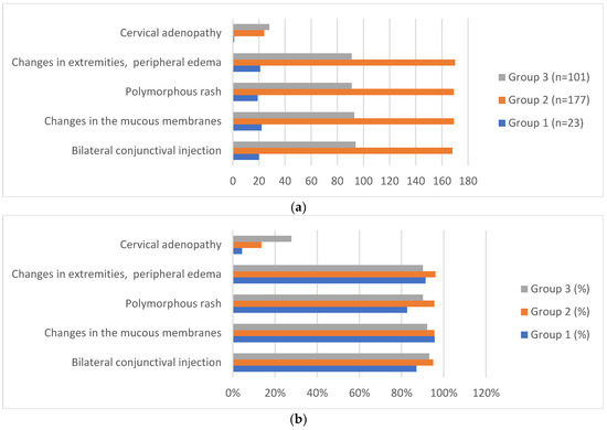 Distribution (a) and percentage (b) of the Kawasaki disease main diagnostic criteria in 301 children according to age at diagnosis. * Bilateral conjunctival injection, p = 0.332. Changes in the mucous membranes, p = 0.565. Polymorphous rash, p = 0.052. Changes in extremities, peripheral edema, p = 0.133. Cervical adenopathy, p = 0.04. ** All patients (n = 301, 100%) had fevers for at least 5 days. *** Group 1: ≤1 year (n = 23), Group 2: ˃1 to ≤4 years (n = 177), and Group 3: >4 to ≤8 years (n = 101).