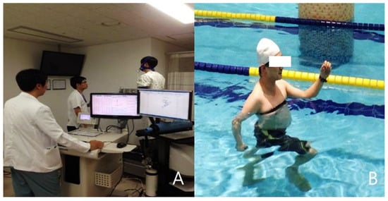 Aquatic exercises are popular activities in the context of fitness, therapy, and rehabilitation []. Aquatic exercises have several advantages over land-based exercises; they lower risks of injury by reducing musculoskeletal loading [], provide a sense of comfort, safety and psychological benefit due to freedom from concerns of falling down [], enable aerobic and resistance exercises to be combined by utilizing the resistance of water [,], and, finally, aid in weight reduction by increasing energy expenditure []. Accordingly, aquatic exercises have recently been prescribed for cardiorespiratory fitness, injured athletes, and the elderly [,,].
