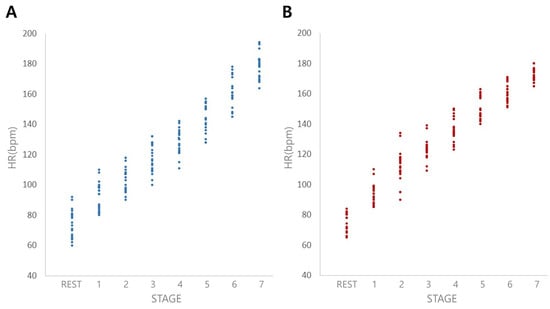 Increase in heart rate (HR) observed during the seven stages of the land-based running test (LRT) (A) and the aquatic running test (ART) (B) from the rest state. Linear relationship between HR and the seven stages in LRT (A) and ART (B) (r = 0.997 and 0.996, respectively, p < 0.001, Spearman’s correlation test); bpm, beats per minute.