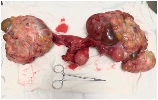 The final aspect—the specimen of total radical hysterectomy with bilateral adnexectomy and excision of the nodules of peritoneal carcinomatosis.