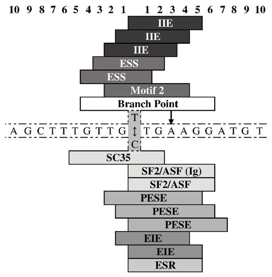 The rs2295827 major and ancestral allele T could generate an additional branch point. Both alleles could potentially change the sequence similarity to a number of splicing enhancers and/or silencers (Figure 2).
