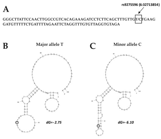 Impact of the single nucleotide polymorphism (SNP) rs9275596 on the DNA secondary structure. (A) Sequence included nucleotide variation T/C (6:32713854). SNP is indicated by an arrow and boxed; DNA secondary structures for (B) T and (C) C alleles. SNP is indicated by arrows; dG, negative energy.