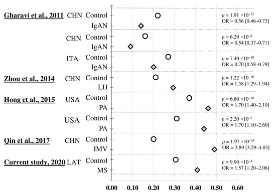 Associations of rs9275596 with particular effects in different ethnic groups. minor allele frequency (MAF) distribution controls and cases in population cohorts. CHN, Chinese Northern Han; ITA, Italian origin; USA, United States of America; LAT, Latvians; IgAN, immunoglobulin A nephropathy; LH, Lupus nephritis; PA, peanut allergy; IMN, idiopathic membranous nephropathy; MS, multiple sclerosis. MAF frequencies in population controls are indicated by white circles; diseases cohorts are represented by gray rhombuses. p value and OR of association are given in accordance with the data from the publications.