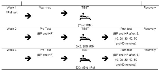 Experimental design of the study. BP: blood pressure, HR: heart rate, 5X5: five sets of 5 repetitions, 5X3: five sets of three repetitions; 1RM: one repetition maximum.