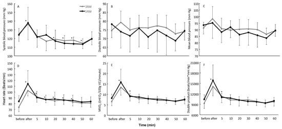 Kinetics of: (A) systolic blood pressure, (B) diastolic blood pressure, (C) mean blood pressure, (D) heart rate, (E) myocardial oxygen consumption (MVO2), and (F) double product before and after bench press resistance exercise using either 90% (5RM) or 95% (3RM) of one repetition maximum. * indicates a significant difference with the baseline measurement on a p < 0.05 level.