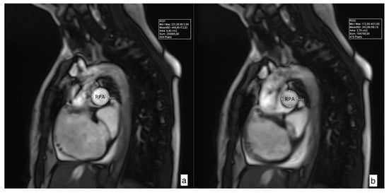 Pulmonary artery distensibility is defined as the relative change in the cross-sectional artery area throughout the cardiac cycle multiplied by the pulse pressure required to induce that change. Since the main pulmonary artery pulse pressure is not readily known, the pulsatility or relative area change (RAC) is used as a surrogate marker of MPA stiffness []. Maximal and minimal areas of pulmonary arteries were measured, and relative area change (RAC) was defined by the following equation: RAC = ((maximum area − minimum area)/minimum area) × 100% (Figure 2) []. These measurements were performed for the main pulmonary artery (MPA), right pulmonary artery (RPA), and left pulmonary artery (LPA).