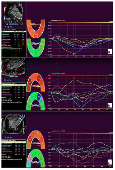 Feature tracking (FT) strain curves of two-chamber (a), three-chamber (b), and four-chamber (c) long-axis views. The global longitudinal strain was calculated by averaging all long-axis strain parameters. The example of longitudinal strain measurements in a patient with pulmonary hypertension.