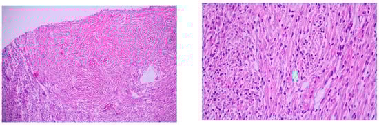 The recent oncological studies have shown, in the cases of PSFT, a fusion of NAB2–STAT6 gene, which is a result of intrachromosomal inversion 12q13.3., characteristic for this type of disease. This type of fusion leads to the development of STAT6 antibody, an immunohistochemical marker for this type of tumor []. Moreover, the mitotic number equal to higher than 4/10 HPF, TERD promoter, and mutation TP53 were correlated with the biological aggressiveness of the tumor []. NAB2–R593W fusion plays a major role in malign PSFT. Meanwhile, FLT1–R593W and KDR–V2971I somatic mutations are proof of the existence of a malignant angiogenetic phenotype [].