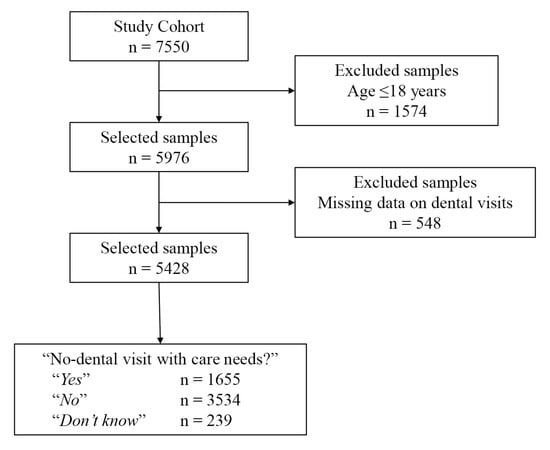 We analyzed the major reasons for not making a dental visit with perceived care needs using descriptive statistics presenting the proportion of specific reasons with a subgroup analysis. The subgroup analysis included a total of 90 participants using unweighted data since a reliable estimation of the weighted frequencies was not feasible. The significance level was set at p < 0.05. The study used publicly-available national-level data without patient identifiers or linkable information. The study was approved by the Institutional Review Board of the Chonnam National University Dental Hospital, Gwangju, Korea (Approval number: CNUDH-EXP-2018-005, approved on 20 November 2018).