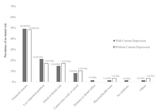The reasons for not seeking regular dental care may include negative memories from previous dental visits, economic deterioration, and unwillingness to improve oral health [,,,]. The findings of the current study showed that the common reasons for not making dental visits by depression status were similar with “financial problem” followed by “less important problems”. Although it is plausible that the oral health problem was affected more by the severity of the depression status [,], our study was limited in making inferences on the exact reasons for why participants with or without depression did not make dental visits. For example, most people with psychiatric disorders have a fear of dental visits due to the characteristics of the mental disease itself [,]. Therefore, further studies including more number of participants are required to elucidate the underlying causes of access barriers to oral health care in people with depression.