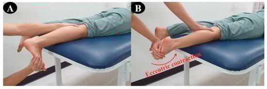 For the 3D exercise interventions in this study, the flexion-abduction-internal rotation and extension-adduction-external rotation, which are the two diagonal (D2) patterns from the PNF leg patterns, were used. The CI technique was applied stressing only the ankle movement in the D2 flexion–extension pattern. The CI technique is a representative method among agonist techniques for PNF, which combines concentric, eccentric, and stabilizing contractions to provide functional training on coordination, joint range of motion, muscle strength and the eccentric control of the subject []. First, the participant performed the D2 extension pattern (plantar–flexion–supination–inversion–toe flexion) using the CI technique in the prone position according to the resistance of the therapist. (Figure 2). Second, she performed the D2 flexion pattern (dorsi–flexion–pronation–eversion–toe extension) using the CI technique, and the counter pattern in the crook lying position (Figure 3). In Figure 1 and Figure 2, the red arrow indicates the direction of application of eccentric contraction during the 3D foot-ankle exercises.