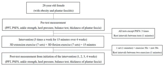 The subject in this study was a 28-year-old woman and college student. She had a constant foot pain due to increased body weight and visited a local hospital. The diagnosis of PF was based on patient history and the results of the radiography, ultrasonography, and physical examination conducted by an orthopedic surgeon. The patient had no foot-related past history, and special hobbies or leisure activities. She received the modality treatment once, including ultrasound and electrotherapy, on the day she was diagnosed with PF. Since then, she has not received and/or experienced any treatment or ankle therapeutic exercises. The subject’s height, weight, and BMI were 158 cm, 70 kg and 28.04 kg/m2, respectively. The subject did not have any musculoskeletal, neurological, or other diseases except PF, and no heel spurs were observed on the radiographs. However, the patient experienced discomfort and pain in the dominant right sole while walking that had persisted for 6 months. The dominant leg was defined as the one that kicks a ball farther []. Through an interview, the participant was informed about the 4-week exercise program and it was explained that the entire course of the study would be conducted in compliance with the Declaration of Helsinki. The study was approved by the Catholic University of Pusan Institutional Review Board (CUPIRB-2019-060).