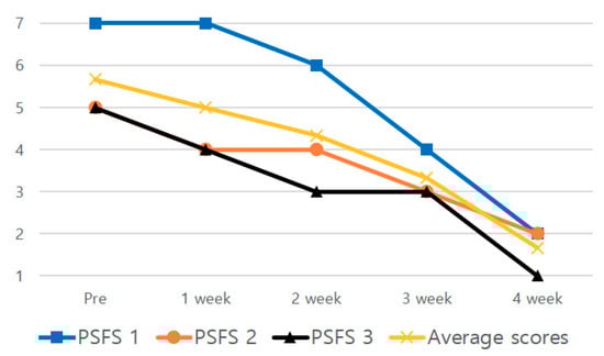 A patient-specific functional scale (PSFS) was used to measure the foot function of the subject. The PSFS is a tool designed for easy use while maintaining validity and reliability in assessing musculoskeletal function in various patients in clinical practices []. Patients are assessed for three to five major activities that they cannot perform or have difficulties performing, with a score of 0 for incapability and 10 for performance at the level before injury []. This study measured the levels of foot function during three major activities through an interview with the subject []. Of the three major activities, the first item (PSFS 1) was “activity after getting up” (as it was shown that foot pain was often most intense with the first steps after waking up) [], the second item (PSFS 2) was “jogging”, and the third item (PSFS 3) was “hill climbing”.