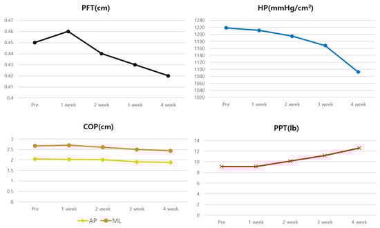 Changes in plantar fascia thickness (PFT), heel pressure (HP), center of pressure (COP), pressure pain threshold (PPT) over 4 weeks.