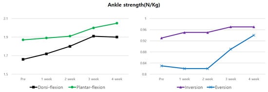 To measure the strength of the ankle joint, dorsiflexion, plantar flexion, inversion, and eversion were performed, and muscle strength was evaluated based on the reference posture presented by Hislop et al. (2013) []. The ankle strength test was performed using a hand-held dynamometer (Commander Muscle Tester, JTECH Medical). To normalize values of ankle muscle strength, muscle strength (N) displayed on the dynamometer was divided by the weight of the subject [,,].