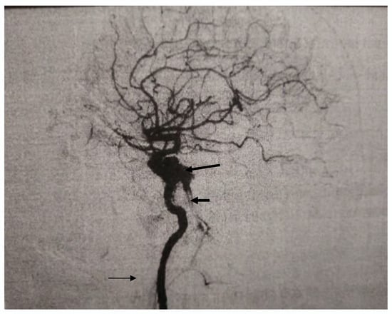 Digital Subtraction Angiography (DSA) finding before the spontaneous occlusion demonstrating carotid-cavernous fistula (long arrow) with enlarged vein (short arrow). Right internal carotid artery (thin arrow).