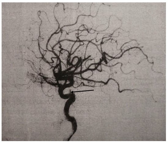 Control Magnetic Resonance Angiography (MRA), arrow indicate the slight enlargement on the intracranial cavernous segment of the right internal carotid artery.