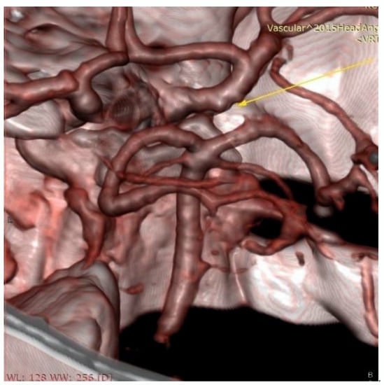 The reference diagnosis of a migraine without aura was also rejected on anamnestic data themselves, because the criteria given in the International Classification of Headaches (ICHD-3) [] were not met. Sudden onset hemicranial primary headache are chronic headache with episodic headache attacks. Clinically our patient had first onset of severe headache, with a duration of three weeks, excludes migraine, and without other accompanying migraine and cranial autonomic symptoms, which exclude trigeminal autonomic cephalalgias such as cluster headache, paroxysmal hemicranias, short-lasting unilateral neuralgiform headache attacks, short-lasting unilateral neuralgiform headache attacks with cranial autonomic symptoms, hemicrania continua. Attention was focused on identifying the underlying cause for the secondary headache in our patient. Research to date shows that in 40% of cases, cough-induced headache was secondary. In most cases, this type of headache is primarily caused by Arnold–Chiari malformation type I and then by other causes (cerebral aneurysms, tumors of the middle and posterior cranial fossa, midbrain cyst, subdural hematoma, reversible cerebral vasoconstriction syndrome, carotid and vertebrobasilar disease, etc.) []. Severe sudden onset secondary headaches present neurological emergences when there is a need to think about subarachnoid hemorrhage, all reasons for raised intracranial pressure, and cerebral infection. Neurological examination, normal CT scan, and normal CSF exclude many of these conditions. For more detailed neuroimaging we performed MRI of the endocranium with arteriography, and because of previous infection we doubted the cerebral venous thrombosis and performed MRI of the endocranium with venography. Since the diagnostic procedures determined the existence of CCF. Using the criteria given in ICHD-3, we diagnosed the patient with headache attributed to dural arteriovenous fistula (DAVF) (Table 2).