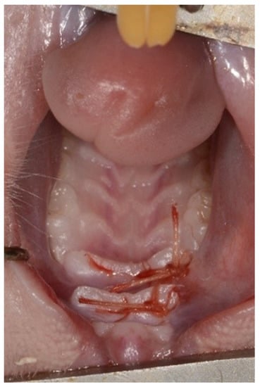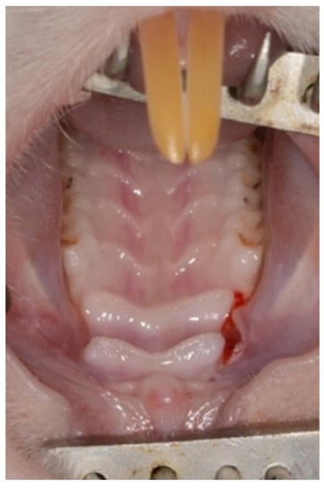 General anesthesia was achieved by an intraperitoneal injection of 0.1% Xylazine (10 mg/kg) and 0.1% Ketamine (80 mg/kg). In addition, Isoflurane (TerrellTM) was administered by a vaporizer at 2%–3% 100–200 mL/min combined with oxygen supply. Local anesthesia was performed using 0.4 mL Lidocaine 0.5% with adrenaline 1:100,000. A palatal incision was made on the maxillary alveolar ridge in the existing edentulous area between the 1st molar and the incisors using a 15c blade (Figure 1).
