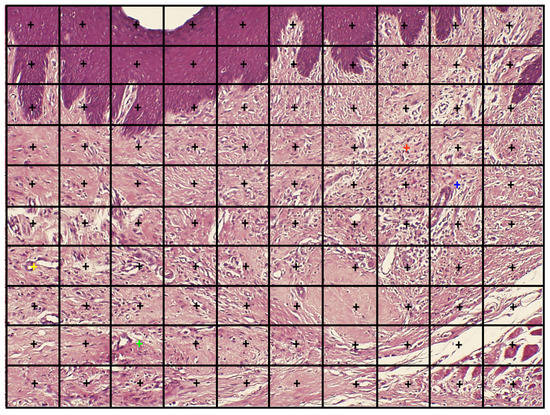 An example of the point-counting method. The "+" overlying the oral lining epithelium at the top of the photomicrograph should be excluded from counting. The yellow "+" overlies a blood vessel, therefore this parameter will be attributed 1 point. The green "+" is only adjacent to a blood vessel, therefore this parameter will score 0 points for the blood vessels. The orange "+" overlies an inflammatory cell (gain of 1 point), the blue "+" is only adjacent to inflammatory cells (0 points) (H&E, original magnification ×100).