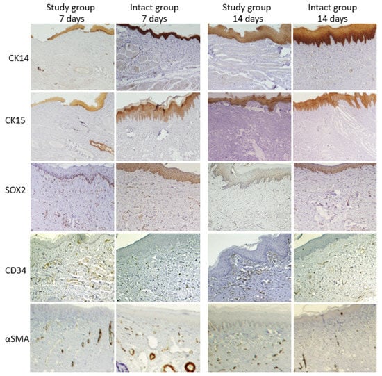 CK15 is another specific marker of the basal epithelium [,]. The low values in the S group at day 14 support the late appearance of K15 in the differentiation process. Some studies showed that like CK14, CK15 can also form a filament network of the cytoskeleton, and as such, acts in a similar way to that of CK14 [].