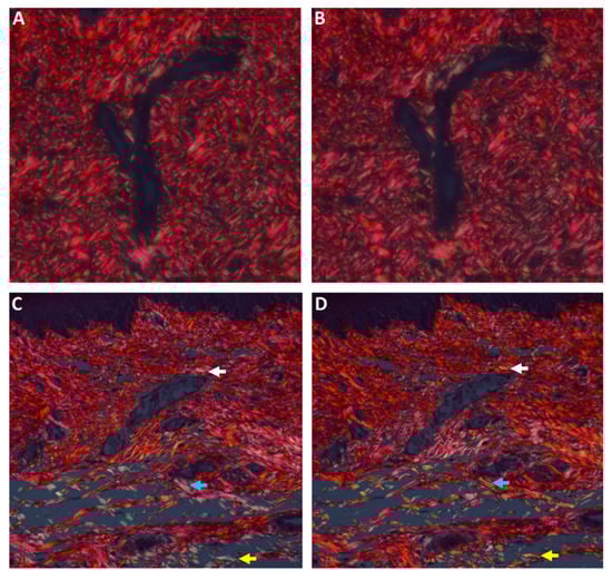 Histopathological sections of picrosirius red-stained collagen fibers seen with polarized light. A and B represent the same field seen at the original position (A) and then rotated 90° (B). The polarization colors do not change after rotation. C and D represent the same field seen at the original position (C) and then rotated 90° (D). Arrows point to collagen fibers that changed polarization colors after rotation. (A–D, original magnification ×400).