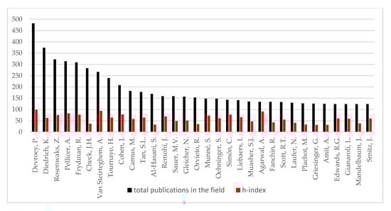 Number of publications in the field and h-index regarding the top 30 authors (order is defined by h-index).