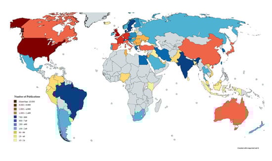 Publications by country (for countries with 10 or more publications), according to Scopus Database.