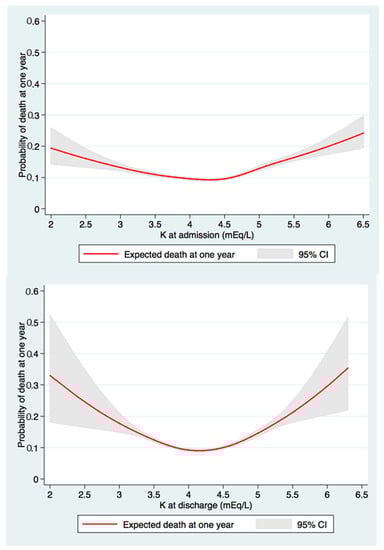 Given that potassium abnormalities are associated with increased mortality, serum potassium is carefully monitored during hospitalization with a narrow potassium variability [,,]. The appropriate correction of serum potassium during hospitalization has been shown to reduce mortality risk [,]. Nevertheless, many patients still have some degree of abnormal serum potassium at hospital discharge [,,,]. Thus, in this current study, we investigated the long-term effects of abnormal potassium levels at hospital discharge by assessing its association with one-year mortality.