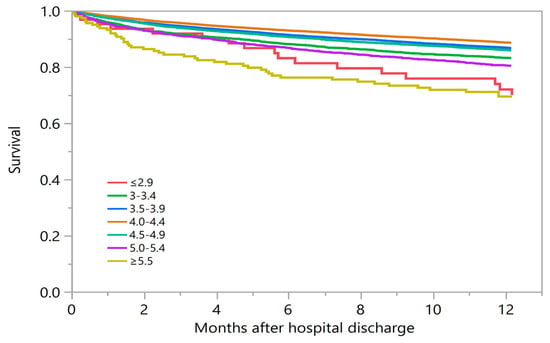 Continuous variables are presented as mean ± standard deviation (SD) and categorical variables as counts with percentages, respectively. Differences in clinical characteristics among discharge potassium groups were tested using ANOVA for continuous variables and a chi-square test for categorical variables. Discharge serum potassium was categorized into seven groups in order to assess the non-linear association with one-year mortality: ≤2.9, 3.0–3.4, 3.5–3.9, 4.0–4.4, 4.5–4.9, 5.0–5.4, and ≥5.5 mEq/L. A discharge serum potassium level of 4.0–4.4 mEq/L was selected as the reference group for outcome comparison because this range was associated with the nadir for one-year mortality. Patient survival was measured from hospital discharge and followed until death or one year after discharge. Patients who were lost to follow-up, or whose vital status was unknown, were censored at the date of their last inpatient/outpatient follow-up visit. One-year mortality risk was estimated using a Kaplan–Meier plot, and it was compared between discharge serum potassium groups using a log-rank test. A multivariable Cox proportional hazards analysis was constructed to analyze the independent risk of one-year mortality with discharge serum potassium, adjusting for age, sex, race, admission and discharge eGFR, principal diagnosis, Charlson comorbidity score, history of coronary artery disease, congestive heart failure, peripheral vascular disease, stroke, diabetes mellitus, chronic obstructive pulmonary disease, cirrhosis, in-hospital acute kidney injury, the use of renal replacement therapy, mechanical ventilation, vasopressor during hospitalization, and admission serum potassium. The interaction between admission and discharge serum potassium on mortality was also tested. Stratified analysis based on admission serum potassium (≤3.9, 4.0–4.9, and ≥5.0 mEq/L) was performed. A two-tailed p-value of less than 0.05 was considered statistically significant. All analyses were performed using JMP statistical software (version 10, SAS Institute, Cary, NC, USA, 2012).