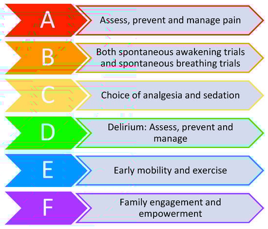 - Morandi, A.; Piva, S.; Ely, E.W.; Myatra, S.N.; Salluh, J.I.F.; Amare, D.; Azoulay, E.; Bellelli, G.; Csomos, A.; Fan, E.; et al. Worldwide Survey of the “Assessing Pain, Both Spontaneous Awakening and Breathing Trials, Choice of Drugs, Delirium Monitoring/Management, Early Exercise/Mobility, and Family Empowerment” (ABCDEF) Bundle. Crit. Care Med. 2017, 45, e1111–e1122. [Google Scholar] [CrossRef]