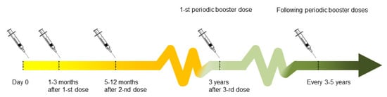 The scheme of vaccination protocol is shown in Figure 1, and may vary from country to county. Since basic vaccination does not provide the full immunization, several booster doses are recommended [].