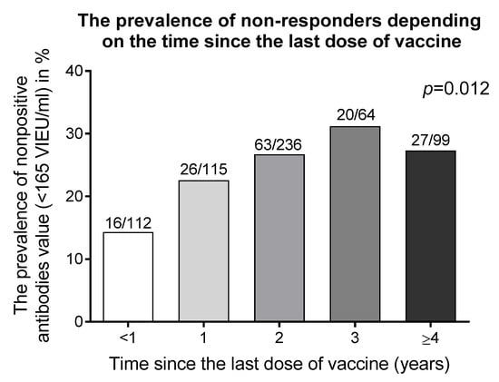The analysis of the time dependent frequency of the seronegative rate of anti-TBEV antibodies concentration (<165 VIEU/mL) showed that time elapsed since the last, third dose of basic vaccination was associated with an increased number of negative results for anti-TBEV antibodies (Chi2 for trend, p = 0.012) (Figure 2).