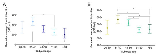 Changes of anti-TBEV antibodies in serum of subjects underwent complete primary vaccination (A) and subjects with primary and at least one booster dose of the vaccine (B) in different age groups. * p < 0.05. TBEV—Tick born encephalitis virus; Data are presented as geometric mean of antibody titer (VIEU/mL) with 95% confidence intervals.
