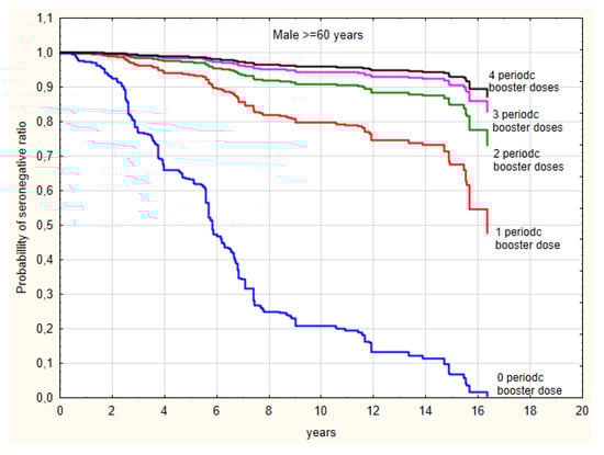 Figure 4 shows the probability of seronegative ratio for men ≥60 years depending on the number of received booster doses.