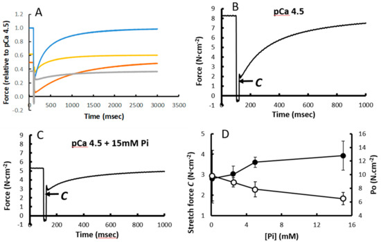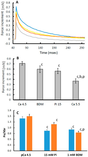 - Caremani, M.; Dantzig, J.; Goldman, Y.E.; Lombardi, V.; Linari, M. Effect of Inorganic Phosphate on the Force and Number of Myosin Cross bridges During the Isometric Contraction of Permeabilized Muscle Fibers from Rabbit Psoas. Biophys. J. 2008, 95, 5798–5808. [Google Scholar] [CrossRef]
