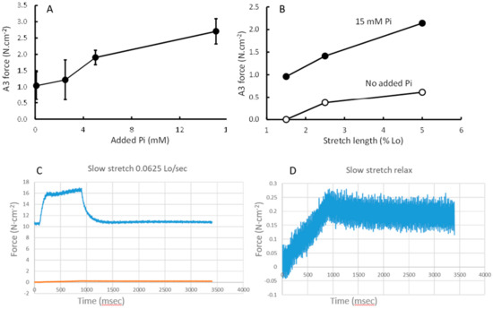 The contribution of the slow exponential component (A3) of stretch relaxation to force during a (A) 5% stretch at 0.0625 l lo·s−1 at different concentrations of inorganic phosphate (Pi) and (B) at different stretch lengths. (C) shows an example of a 5% stretch at 0.0625 lo·s−1 in pCa4.5 and (D) a similar stretch in relaxed state.