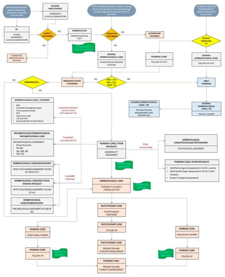 In November 2004, the Italian regulatory Activity of Pharmaceuticals Agency (AIFA) instituted the “Psocare” project, offering qualified healthcare personnel and ensuring effective, personalized, and cutting-edge therapies for Pso based on the latest best practices []. However, in Italy, there are enormous differences in patient care among the various regions, and validated Diagnostic–Therapeutic Care Pathways (DTCPs) are still poorly used [].