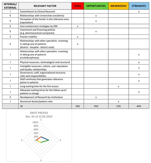 We conducted a SWOT analysis (Strengths, Weaknesses, Opportunities and Threats; a strategic planning technique) to identify our internal strengths and weaknesses as well as external opportunities and threats. In this document, we detailed the different areas and activities of Pso care and defined the purpose and mission of the activity to be certified (i.e., the DTCP for patients affected by Pso and clinical research in our facilities) (Figure 3). In this phase, we produced a document explaining our quality policy and evaluated the satisfaction of both patients and staff through the use of questionnaires. The majority of patients gave a high score for the services provided by our center. Furthermore, most of our staff thought that their work was stimulating, recognized, and valued.